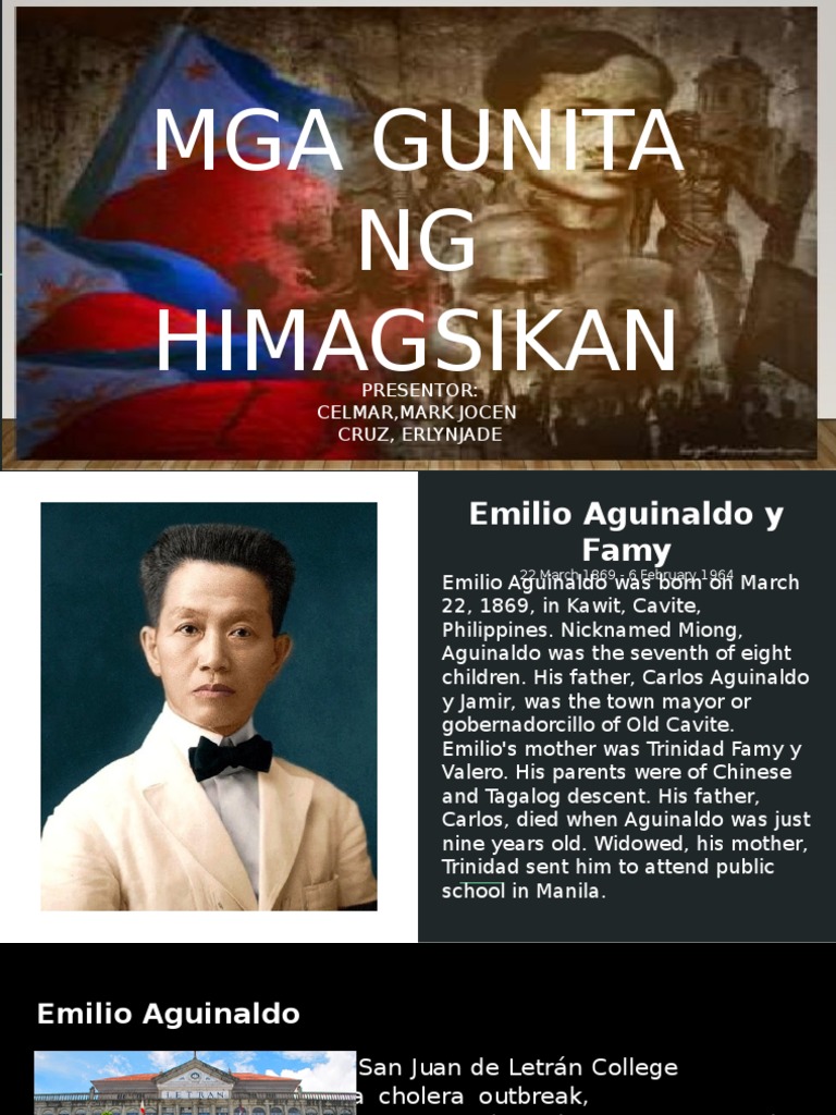 Taon ng himagsika. Ang marami sa kanyang mga sinulat ay pawang tungkol sa puitika sa pamahalaan at sa pagpapalaganap ng damdaming makabayan. Isang taon pagkaraang mapatay si Bonifacio nasugatan si Emilio Jacinto sa Labanan at nadakip siya ng mga kaaway. CELMARMARK JOCEN CRUZ ERLYNJADE Emilio Aguinaldo y Famy 22 March 1869 - 6 February 1964 Emilio Aguinaldo was born on March 22 1869 in Kawit Cavite Philippines.
