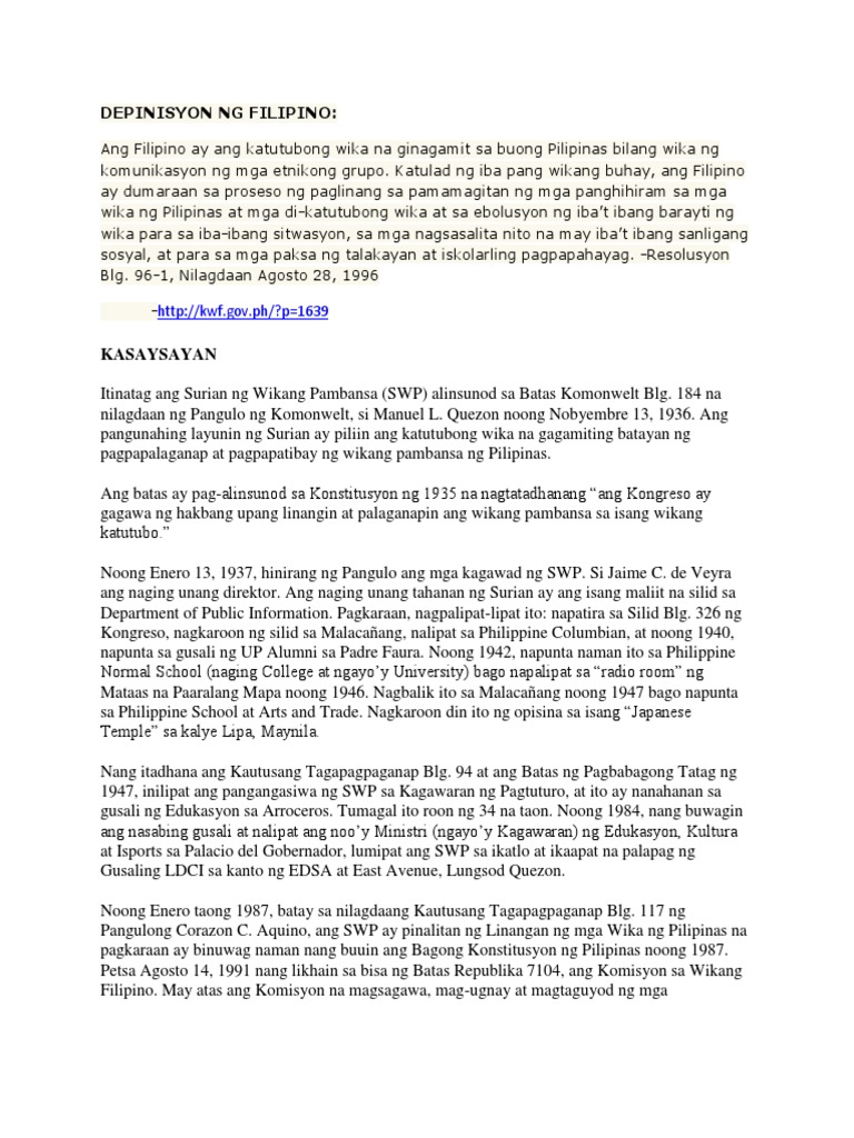 Filipino 28102019 1829 kuanjunjunkuan Tukuyin anong akademikong sulatin batay sa napag aralan mo sa kursong ito ang dapat gamitin sa mga sumusunod na sitwasyon pagsulat ng. Timeline 1934 Kumbensyong Konstitusyunal Ito ay binubuo ng mga delegado mula sa ibat ibang parte ng Pilipinas. Simula pa nuong 1955 ay ipinagdiriwang natin ang Linggo ng Wika tuwing Agosto 1319 upang parangalan din si Quezon bilang Ama ng Wikang Filipino.