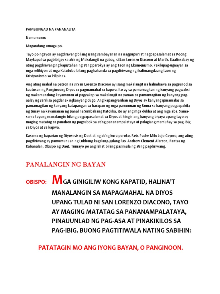 Isang sambayanan na naglilingkod bilang pari propeta at hari. Lahat po ng mga bagay na Inyong ibinibigay sa amin ay patunay ng Inyong walang hanggang pagmamahal. Sa Iyo Ama salamat dahil mula sa dilim inakay Mo kami patungo sa liwanag.