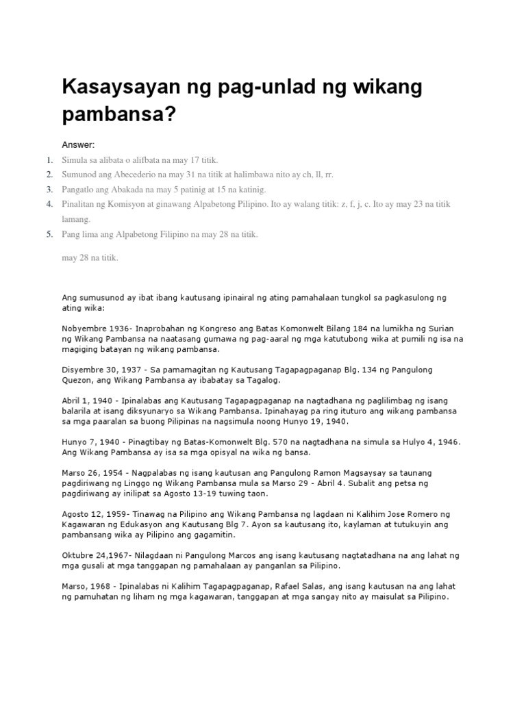 Wika at taon kaugnay sa kasaysayan ng wikang pambansa. -Bilang kabataang Filipino makapag-aambag ako sa lalong ikahuhusay ng Wikang Pambansa bilang wika ng karunungan sa pamamagitan ng patuloy na paggamit nito at pagmahal nito bilang sariling atin nang sa ganon ay patuloy itong magbago at umunlad hanggang sa umabot pa sa mga susunod na henerasyon at mapigilan ito sa unti unting paglaho. Pagtapatin ang wika at taon kaugnay ng kasaysayan ng wikang pambansa. Ngunit magkakabisa lamang ang nasabing kautusan pagkaraan ng dalawang taon at ganap masisilayan noong 1940.