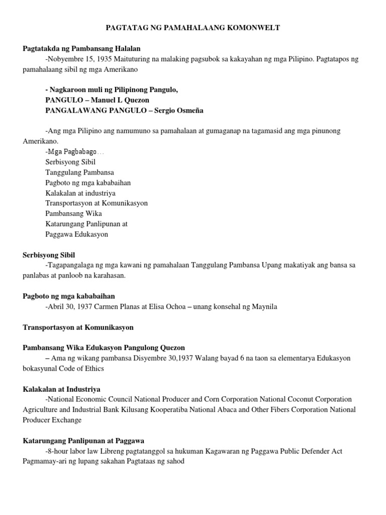 Write 1 for the first bevent 2 for the second 3 for the third and so on. Quezon bilang hudyat sa pagsisimula ng Pamahalaang Komonwelt. Layunin ng pamahalaang ito na sanayin ang mga Pilipino sa sariling pamamahala at gawing matatag ang sistemang pampolitika at mapaunlad ang kabuhayan ng bansa sa loob ng sampung taon.