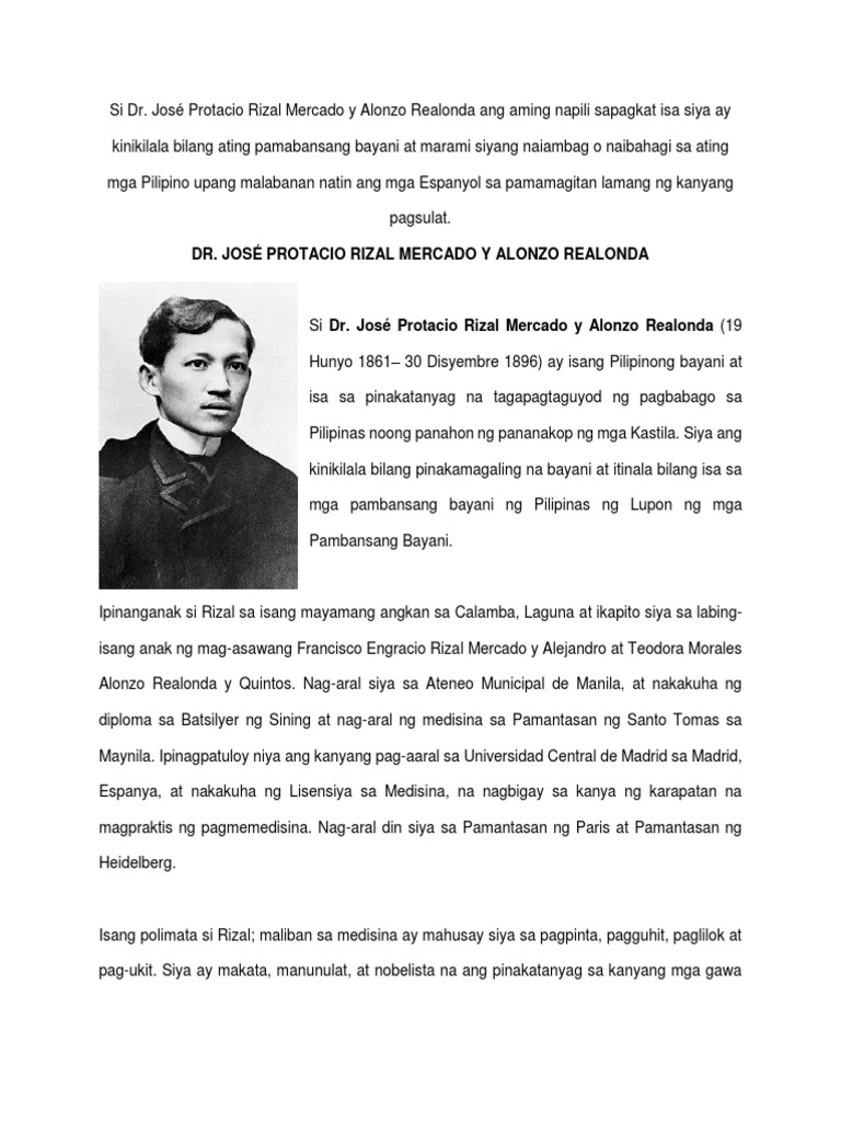 Ang sabi ng mga doctor ay wala na iyong remedyo. Sa mas malalim na pagtatakalay ay makikitang naniniwala si Rizal na hindi lahi ang hadlang sa edukasyon kundi ang kakulangan ng sariling lahi na gagabay sa sariling bayanIto ang nagbunsod sa kaniya upang tumiwalag sa La Solidaridad noong kaniyang malaman na ang tunay na layunin ni del Pilar sa pagtungo sa kanluran ay ang pansariling pananatili lamang. Jose Protacio Rizal ay ang Pambansang Bayani ng Pilipinas.