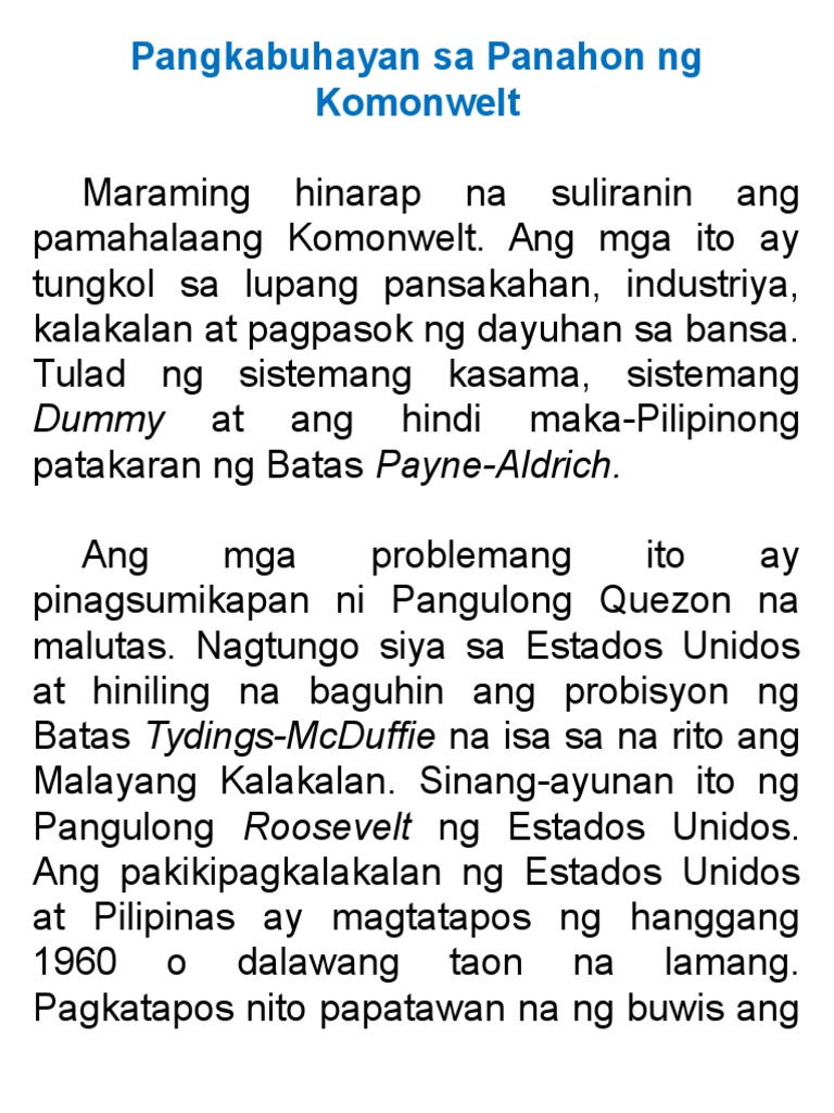 PAMAHALAANG KOMONWELT- Ayon sa Batas Tydings-McDuffielayunin ng pamahalaang Komonwelt na masubok ang kakayahan ng mga Pilipino sa pangangasiwa ng sariling pamahalaanSampung taon ang ibinigay ng mga Amerikano upang mahasa ang mga Pilipino sa mga kasanayang pampulitika at panlipunanMagsasanay sila sa pagkilala ng mga suliranin pagsusuri sa mga itoat pagbibigay ng.